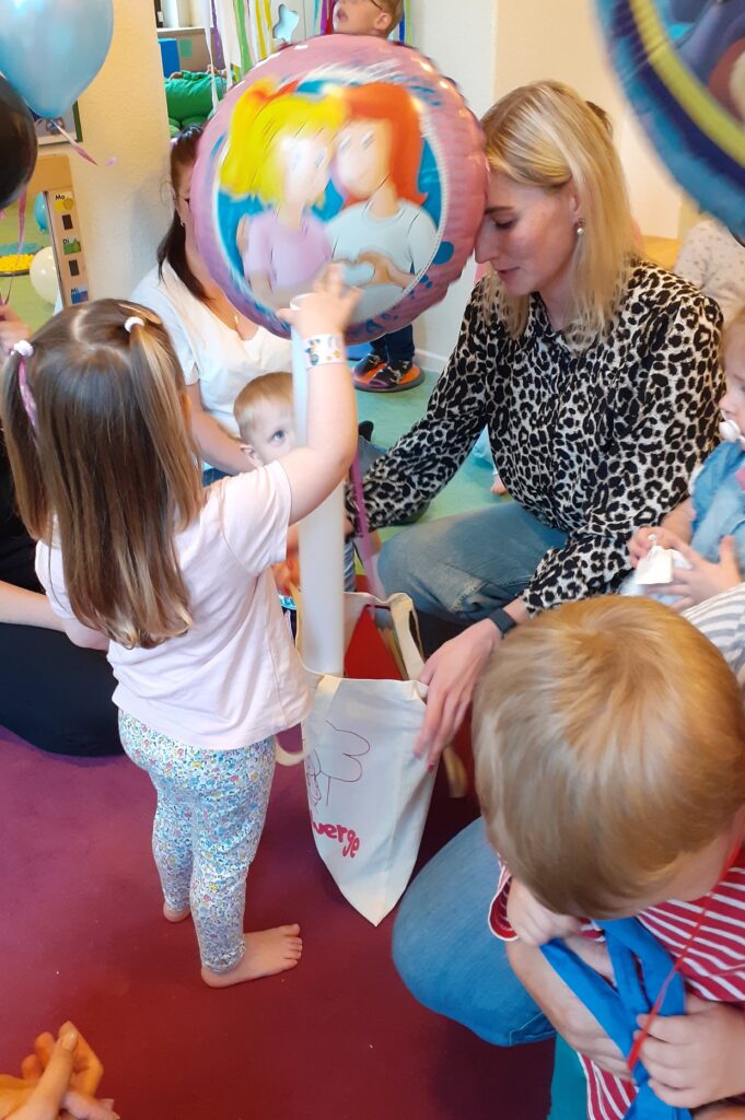 Im Begrüßungskreis sangen wir gemeinsam „Das Lied über mich“ und Frau Schwarz richtete ein paar persönliche Worte an die Kinder und Familien. Danach folgte die Feierstunde: Im Abschiedskreis wurde „Im Garten steht ein Blümelein“ gesungen und jedes Kind bekam zum Abschied eine Tasche mit dem Wallzwerge-Logo, seinen Portfolioordner und einen bunten Luftballon.